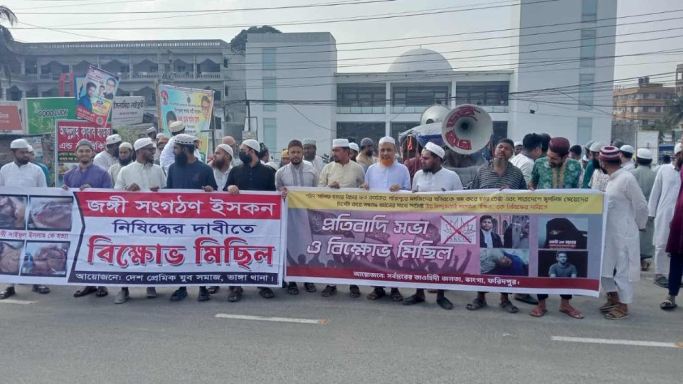 বাংলাদেশে সম্প্রতি ইসকন কর্তৃক পরিচালিত খুন, গুম এবং মুসলমানদের উপর নির্যাতন ও প্ররোচণামূলক কর্মকাণ্ডে গভীর উদ্বেগ প্রকাশ বাংলাদেশে ইসকন সংগঠনকে নিষিদ্ধের দাবিতে ফরিদপুরের ভাঙ্গায় সর্বস্তরের তাওহীদি জনতার ব্যানারে এক বিক্ষোভ মিছিল ও শান্তিপূর্ণ সমাবেশ অনুষ্ঠিত হয়েছে।